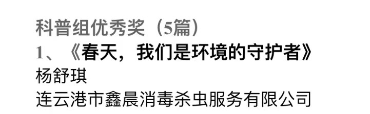 連云港市鑫晨消毒殺蟲服務有限公司楊舒琪《春天,我們是環境的守護者》獲得2021年“衛康杯”征文賽科普組優秀獎。